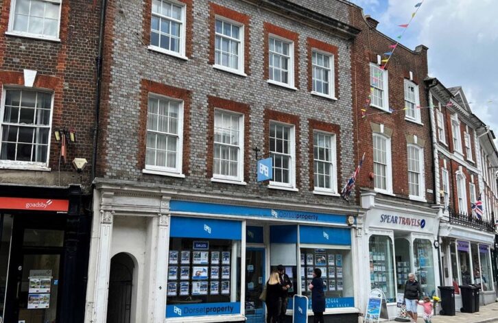 A pair of freehold buildings, comprising five flats and two shops in the Georgian gem town of Blandford Forum, Dorset, is going to auction with a guide price at £600,000 on 15 June.