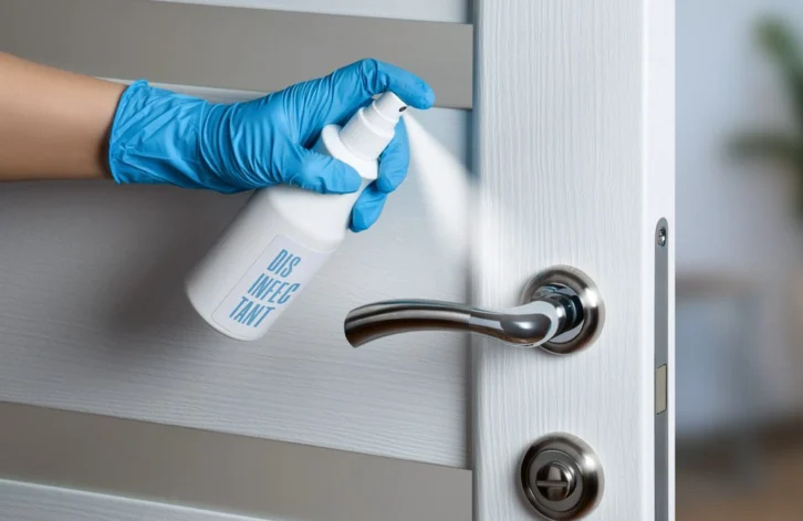During a viral deep clean, a technician in protective gear uses a spray cannister to apply non-toxic virucidal solution, killing 99.999% of germs.