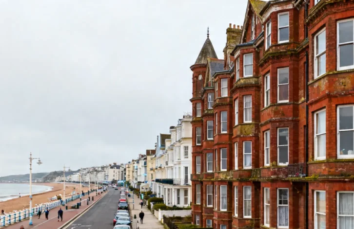 In Brighton, East Sussex, a three-bedroom ground-floor apartment in Kingscliffe Court, overlooking the Grade II-listed Kemp Town Enclosures, is available for £550,000. The Victorian mansion block property is positioned one road back from Marine Parade, which forms part of the Brighton Marathon route. The apartment features a reception room with an inglenook fireplace and oak beam.